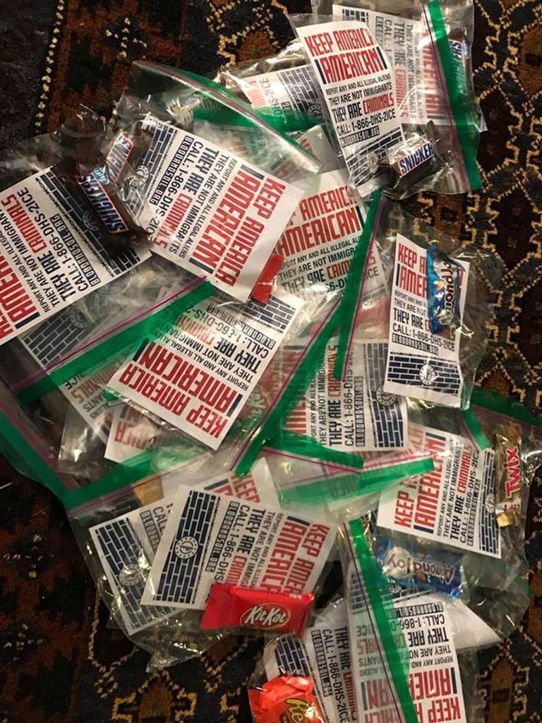 Chaney said many of her neighbors are immigrants but wasn’t sure if that factored into their neighborhood being targeted. She went around and collected more than 60 fliers over a few blocks. Some of the candy had been eaten while the fliers had been left behind.
