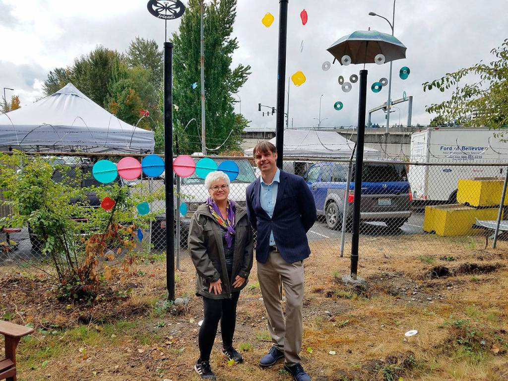 The sculptures in the garden are made out of repurposed material. Griffin says his designs relied on the available materials. He used old shower drains, CDs, discs and an umbrella to build the sculptures. It was a whimsical idea that simply developed along the way. The men even received donations from Goodwill, The Home Depot and QFC.