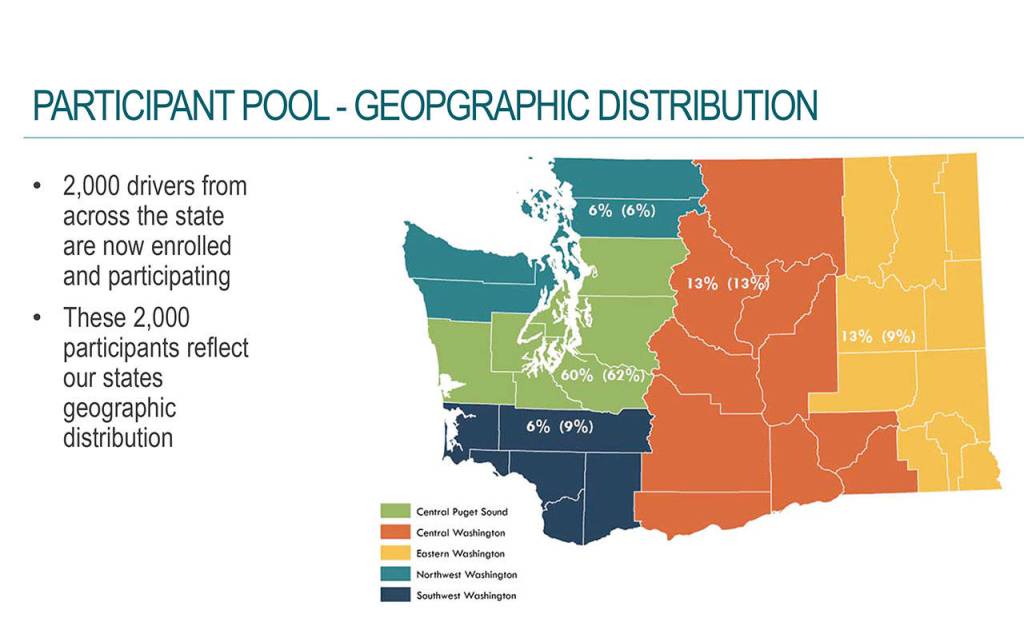 The pilot has 2,000 participants throughout the state with 6 percent in Northeast Washington, 60 percent in the Central Puget Sound, 6 percent in Southeast Washington, 13 percent in Central Washington and 13 percent in Eastern Washington.
