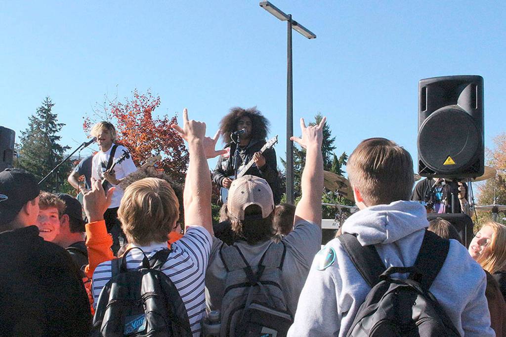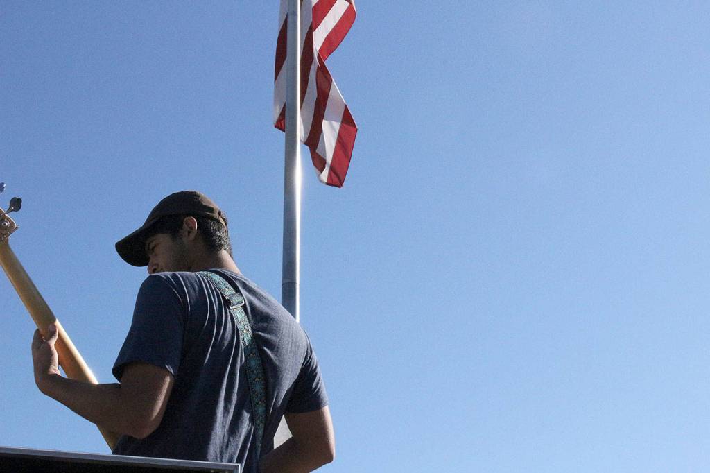 The performance at Mt. Si High School captured students’ interest, though many kept their distance from the truck bed stage. Throughout the hour-long show, guitarist Wilson Rahn continually encouraged students to come up to the stage. Slowly, students ran up to the stage until a large “mosh pit” of dancing students formed.