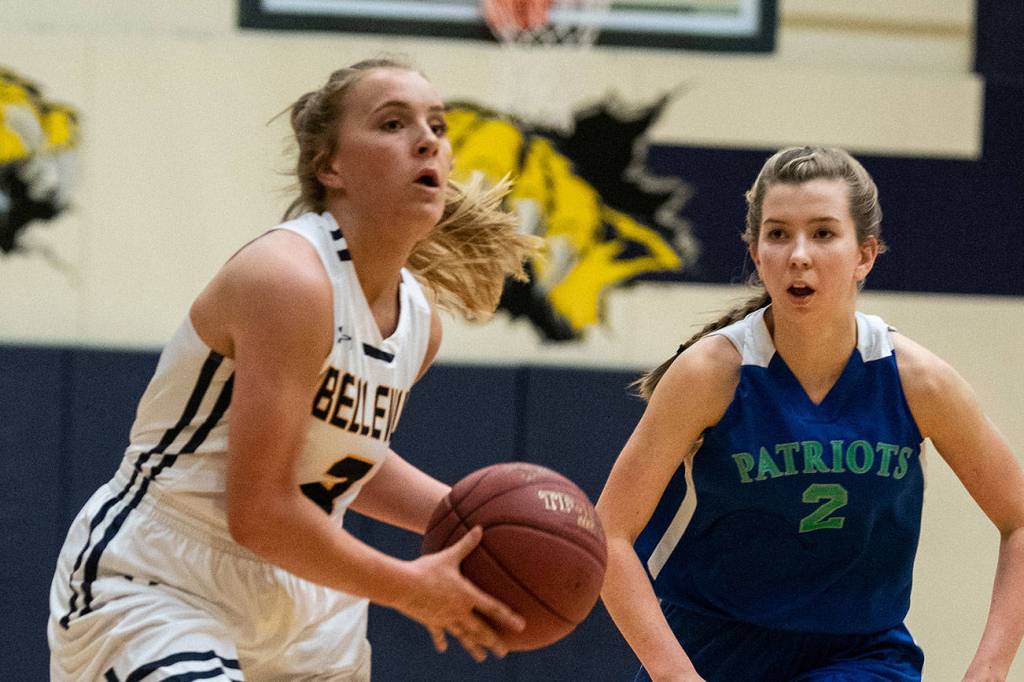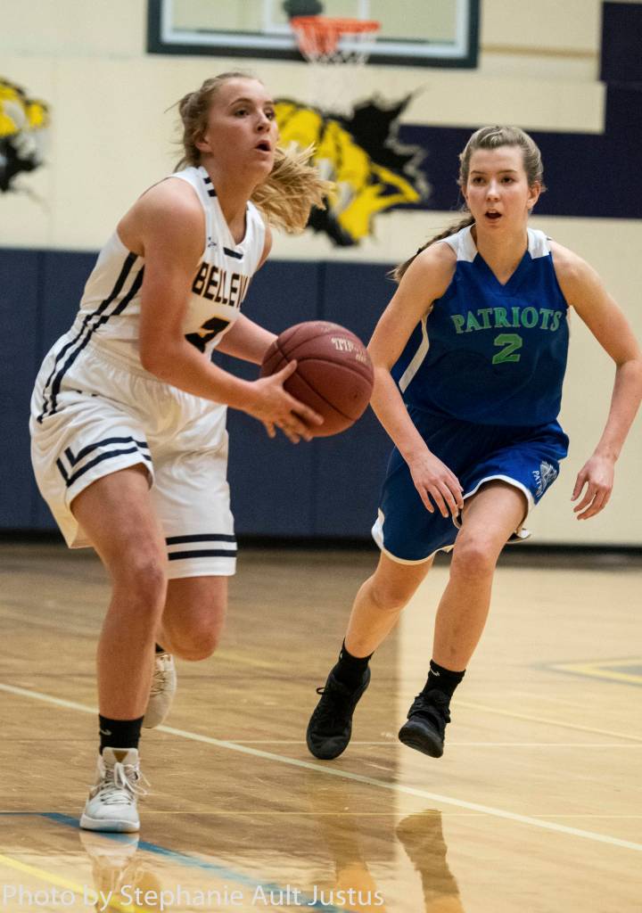 The Bellevue Wolverines girls basketball team earned a 47-44 victory against the Liberty Patriots on Jan. 30. The Wolverines improved their overall record to 9-10 with the win. Bellevue senior Montana Jones, left, prepares to make a pass down the court while being chased by Liberty shooting guard Grace Moawad during the matchup between KingCo rivals.