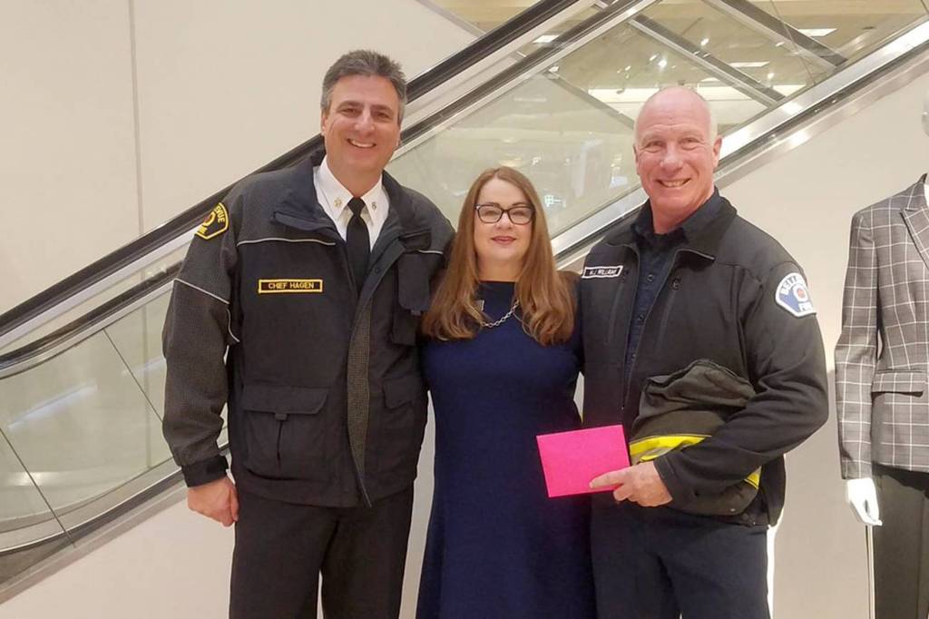 Chief Hagen and Firefighter Williams accept nearly $2,000 in donations made at the till. $6,000 was raised in total at Nordstrom. Photo courtesy of Bellevue Fire Department.