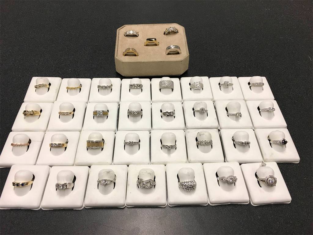 After a search was conducted on the residence, officers recovered about 35 assorted engagement-style diamond rings. All but one ring had a price label attached.