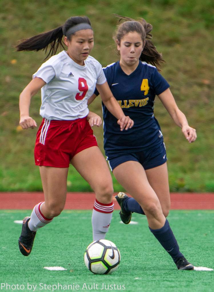 Newport freshman Maggie Ma (9) and Bellevue junior Audrey Miller (4) both go for the ball during a 4-0 Bellevue win on Oct. 19. Photo courtesy of Stephanie Ault Justus