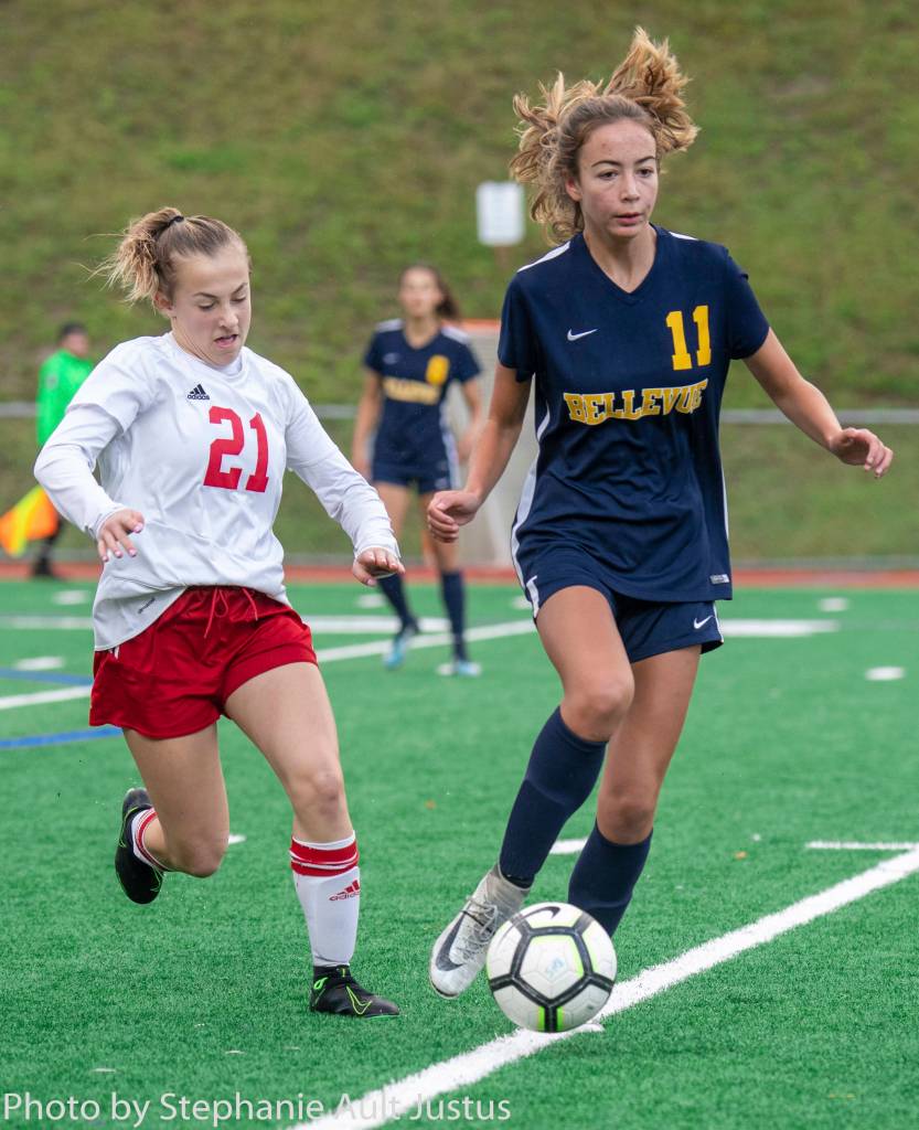 Photo courtesy of Stephanie Ault Justus                                Newport midfielder Elsie Bencke (21) chases after Bellevue midfielder Kennedy Shorett (11) in the Wolverines’ 4-0 win on Oct. 19.