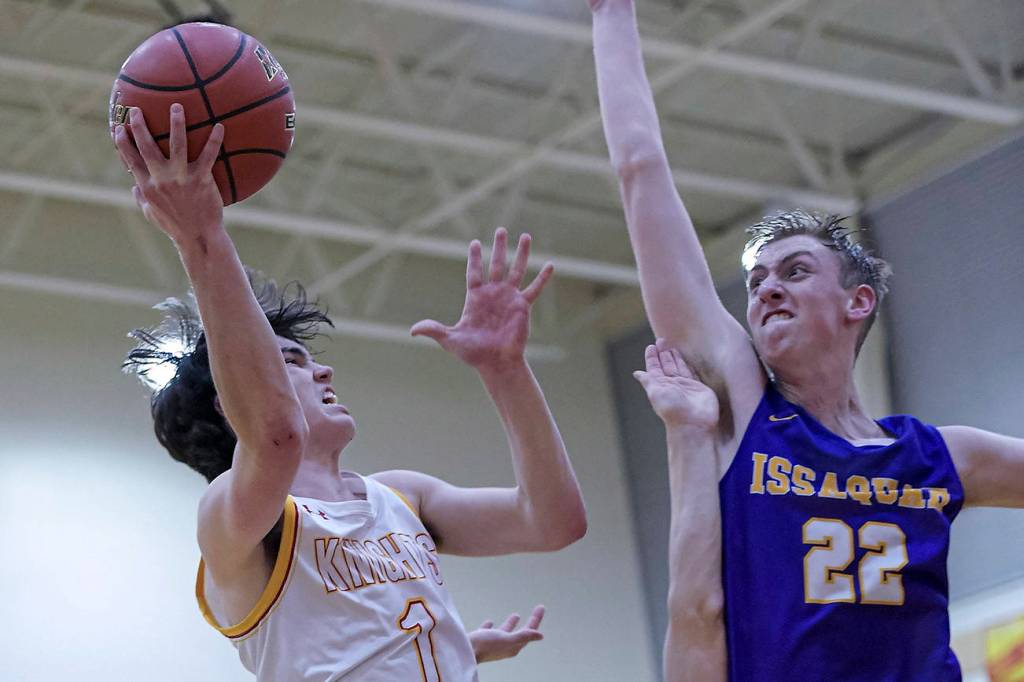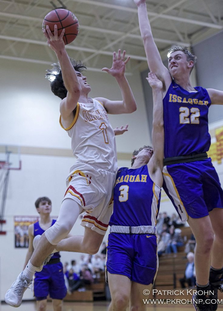 Newport’s Ryan Thompson (left) drives to the hoop while being defended by Issaquah’s Coben Kaveny (middle) and Danny Howe (right) on Jan. 3. Thompson led the Knights with 28 points in their 71-66 loss to Issaquah. Photo courtesy of Patrick Krohn/Patrick Krohn Photography
