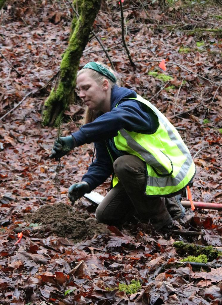 One of the EarthCorps group leaders Jenny Hakala shows volunteers how to plant a tree. Andy Nystrom/ staff photo