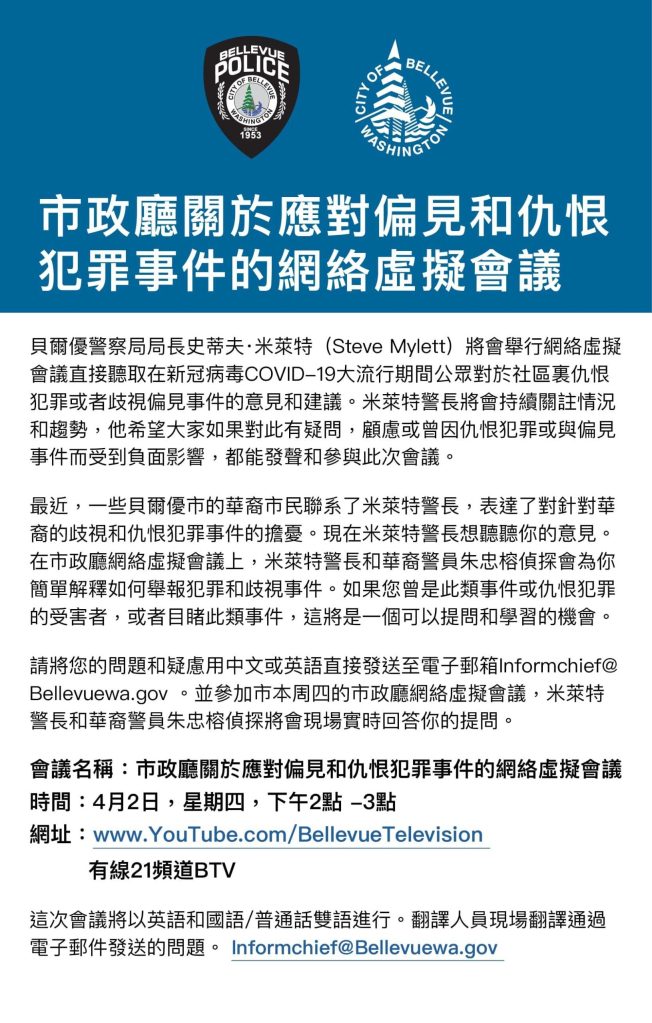 As previously reported, Bellevue residents of Chinese heritage have recently contacted Mylett, alerting him of these types of incidents. During the meeting Mylett and BPD Det. Zhong Zhu were going to outline the steps to report crimes and incidents. Members of the public will also have the opportunity to ask questions and learn what to do if they are victimized or witness a bias incident or hate crime.
