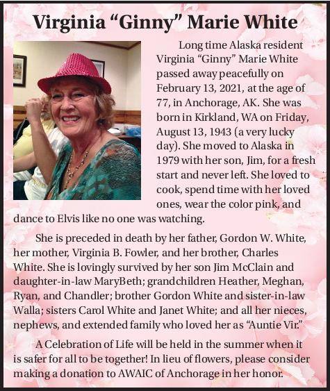 Longtime Alaska resident Virginia “Ginny” Marie White passed away peacefully on February 13, 2021, at the age of 77, in Anchorage, AK.