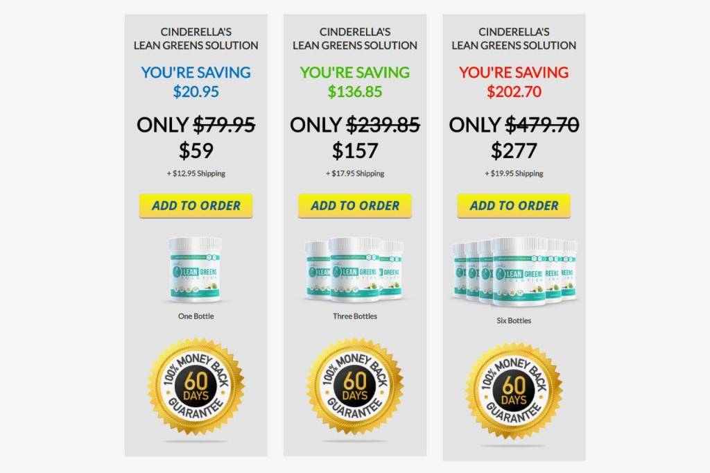 At its full price, a jar of Cinderella Lean Greens Solution normally costs $79.95, but that’s not what consumers have to pay today. Instead, one jar costs $59.00, plus the cost of shipping. By ordering more of the formula at once, these savings increase even more. The other packages include: