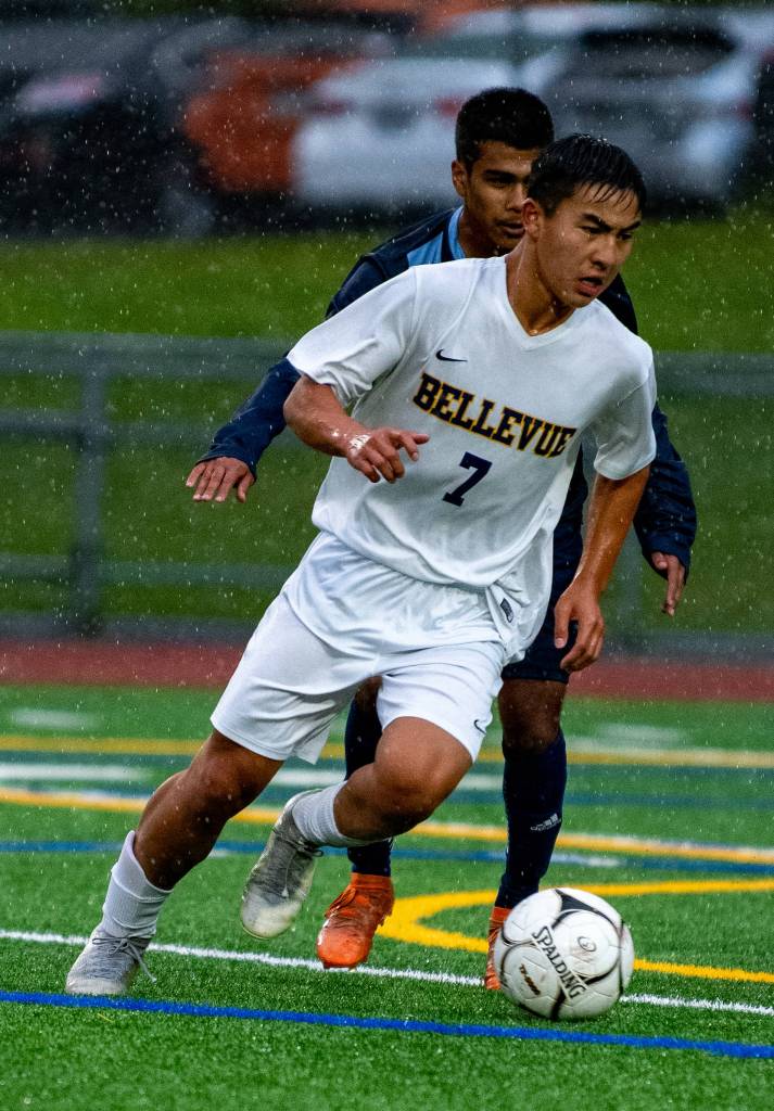 Bellevue’s Dylan Khuu, front, scored on a free kick in the Wolverines’ 1-1 draw with Interlake in boys soccer action on May 18. Interlake equalized on a Bellevue own goal. Photo courtesy of Stephanie Ault Justus