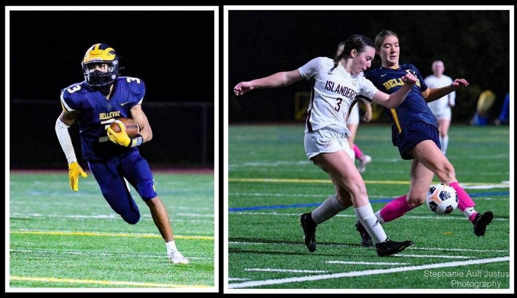 Bellevue’s Ishaan Daniels bolts up field for a touchdown during the Wolverines’ 56-0 football victory over Juanita on Oct. 29. Mercer Island’s Annabel Little battles Bellevue’s Hannah Enger for the ball during the Wolverines’ 5-0 senior night girls soccer victory on Oct. 28. Bellevue goals were supplied by Nova Wei (two), Rebekah Roth, Enger and Kendall Serres. In soccer, Bellevue defeated Liberty (Renton), 4-0, on Nov. 2 to notch the 3A KingCo championship and advance to state. In football, Bellevue will host Southridge at 7 p.m. Nov. 5 in a district matchup. Photos courtesy of Stephanie Ault Justus