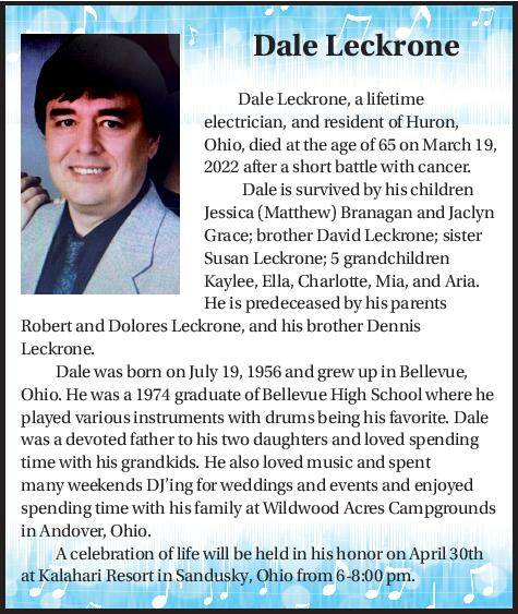 Dale Leckrone, a lifetime electrician, and resident of Huron, Ohio, died at the age of 65 on March 19, 2022 after a short battle with cancer.