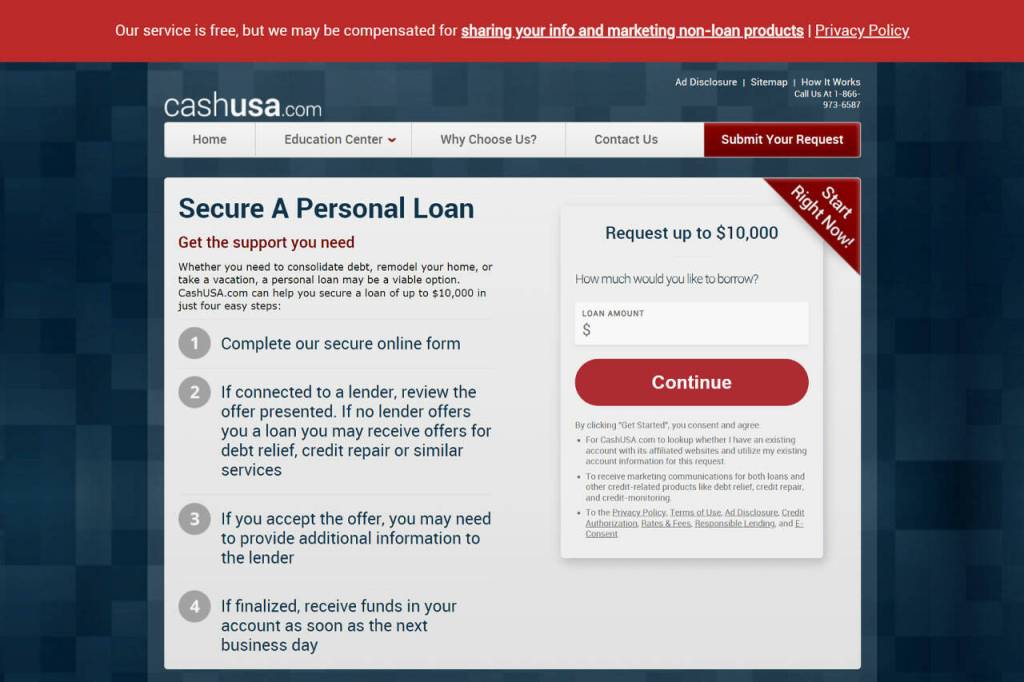CashUSA is another online lending marketplace that gets borrowers connected with the creditors they are seeking to secure a loan. The electronic form asks you your local zip code when you were born and the last four digits of your Social Security Number to screen you for eligibility.