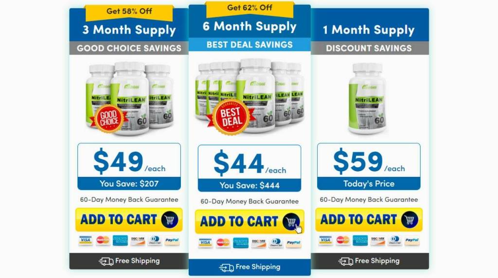 Ordering the NitriLEAN formula is only possible from one source – the official website. On the website, users will choose a few different packages, separated only by their quantity. All of the packages come with free shipping, but users save a lot of money by stocking up while they can.