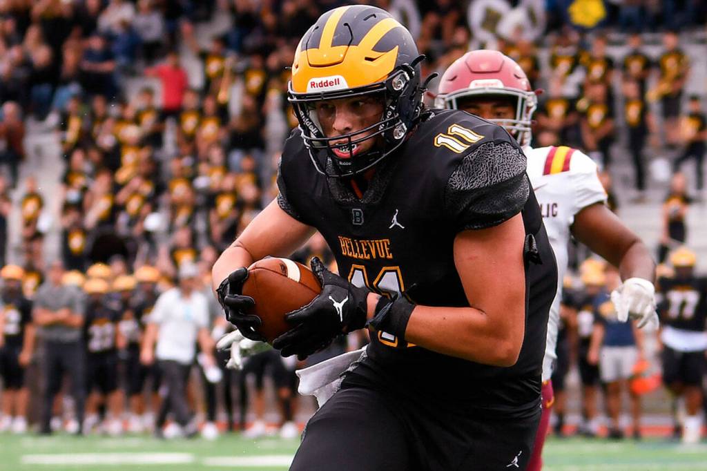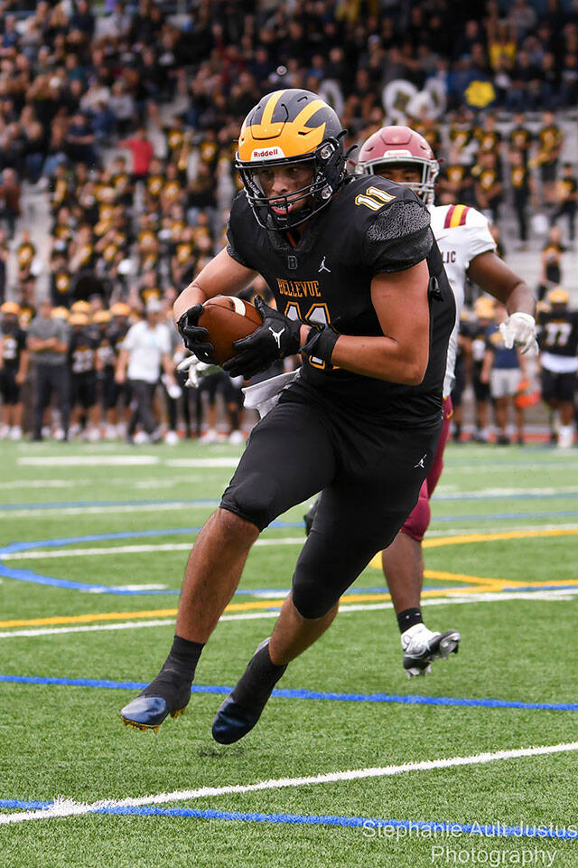 Bellevue High School’s junior and tight end, Hogan Hanson (#11), scores a touchdown. Courtesy of Stephanie Ault Justus.