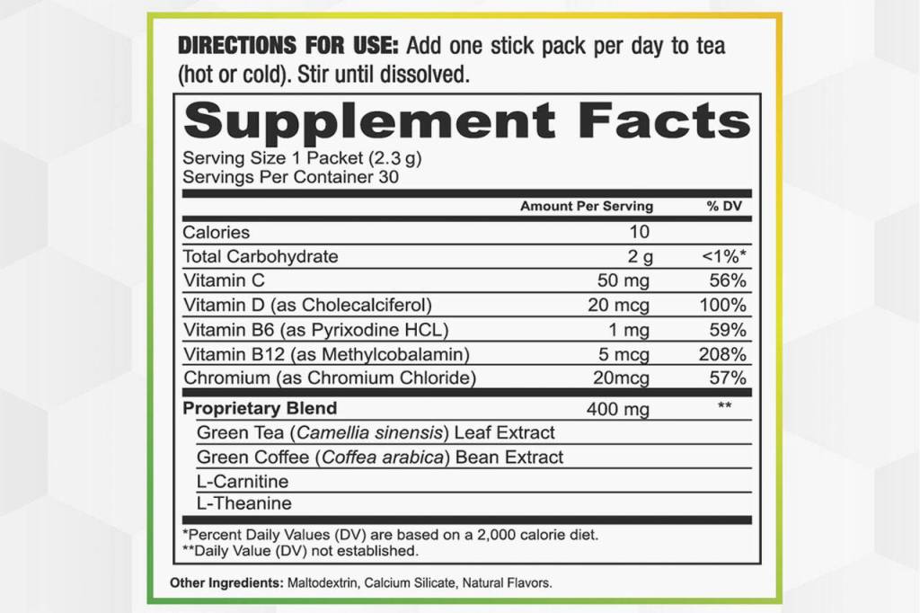 Tea Ignite uses a proprietary blend of ingredients, which include green tea, green coffee beans, L-Carnitine, and L-Theanine.