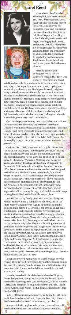 In 1956 the young family grew with a second daughter, Marian Elizabeth and a son John Porter Reed, III, in 1957. From Mercer Island they moved to Bellevue and built a home in their beloved Vuecrest neighborhood in Bellevue, Washington. Janet’s favorite hobbies were composing music and writing poetry. She could hear a song, sit at the piano, and play it by ear. Along with being a mother and homemaker Janet had the energy and enthusiasm to start taking on leadership roles. She was a founding member of both the Cascade chapter of the Daughters of the American Revolution and the Eastside Republican Club. She joined the Bellevue Probus Club, was President of the Bellevue Republican Women’s Club, active in the Hilltop Luncheon Club, and Dance Elegance. As if that wasn’t enough, she continued to be elected for twenty-eight years to serve as the GOP Precinct Committee Officer for the Vuecrest neighborhood. Janet had intense interest in partisan and non-partisan politics her entire life receiving the 41st District Republican of the year in 1980.