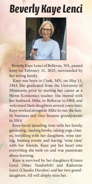 Beverly Kaye Lenci of Bellevue, WA, passed away on February 11, 2023, surrounded by her loving family.