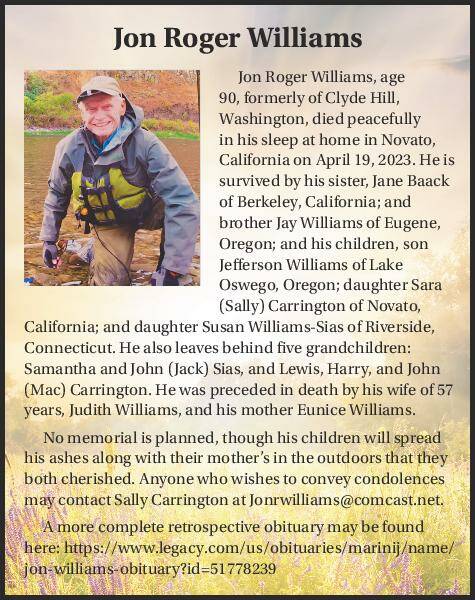 Jon Roger Williams, age 90, formerly of Clyde Hill, Washington, died peacefully in his sleep at home in Novato, California on April 19, 2023. He is survived by his sister, Jane Baack of Berkeley, California; and brother Jay Williams of Eugene, Oregon; and his children, son Jefferson Williams of Lake Oswego, Oregon; daughter Sara (Sally) Carrington of Novato,
