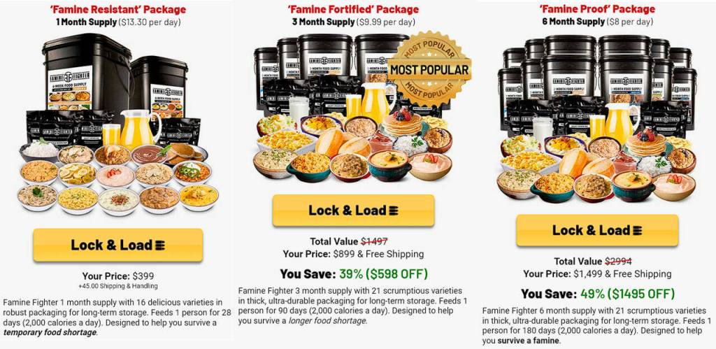 - Famine Resistant Package (3-month Supply) at $899 + free shipping;