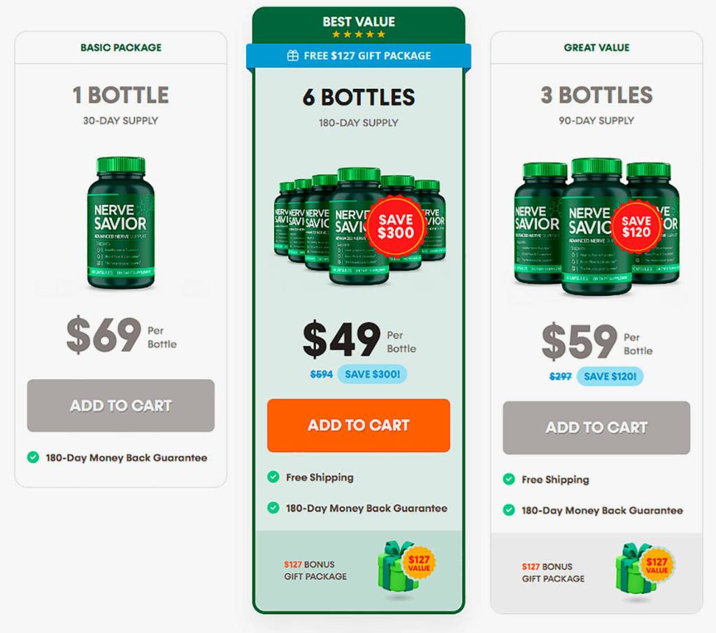 - Three bottles of Nerve Savior at $59 per bottle + free shipping + bonus package;