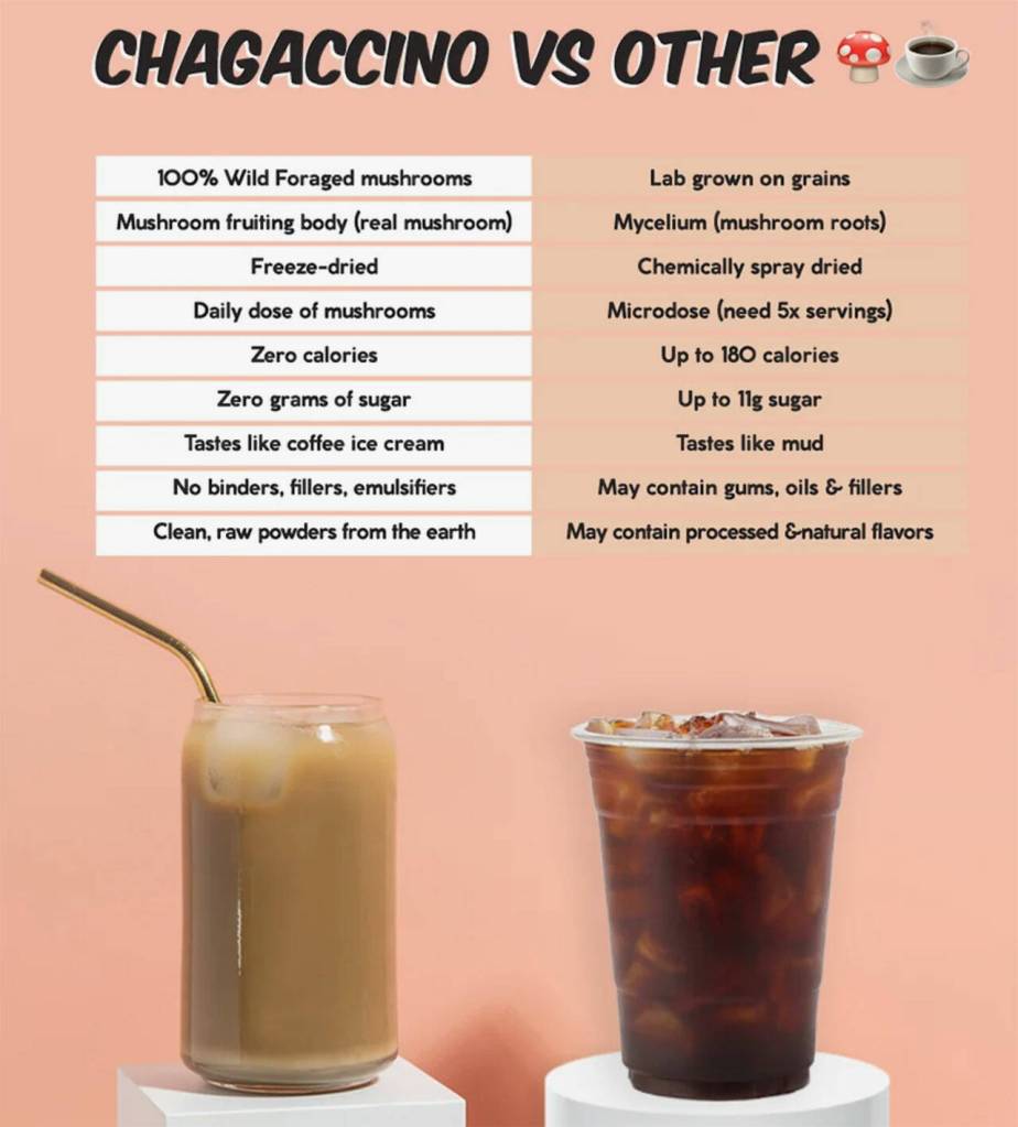 - Chagaccino is free from calories, sugars, gluten, chemicals, artificial flavors and habit-forming ingredients;