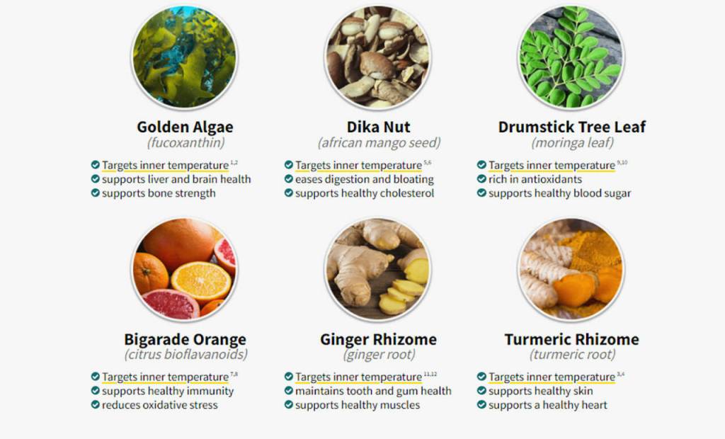 Fucoxanthin, African mango seed, Ginger, Turmeric, Moringa leaves, and Citrus bioflavonoids.