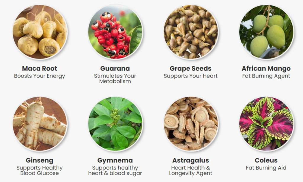 Maca Root, Grape Seeds, Panax Ginseng, Astragalus, Gymnema Sylvestre, African Mango, Coleus, Guarana, etc.