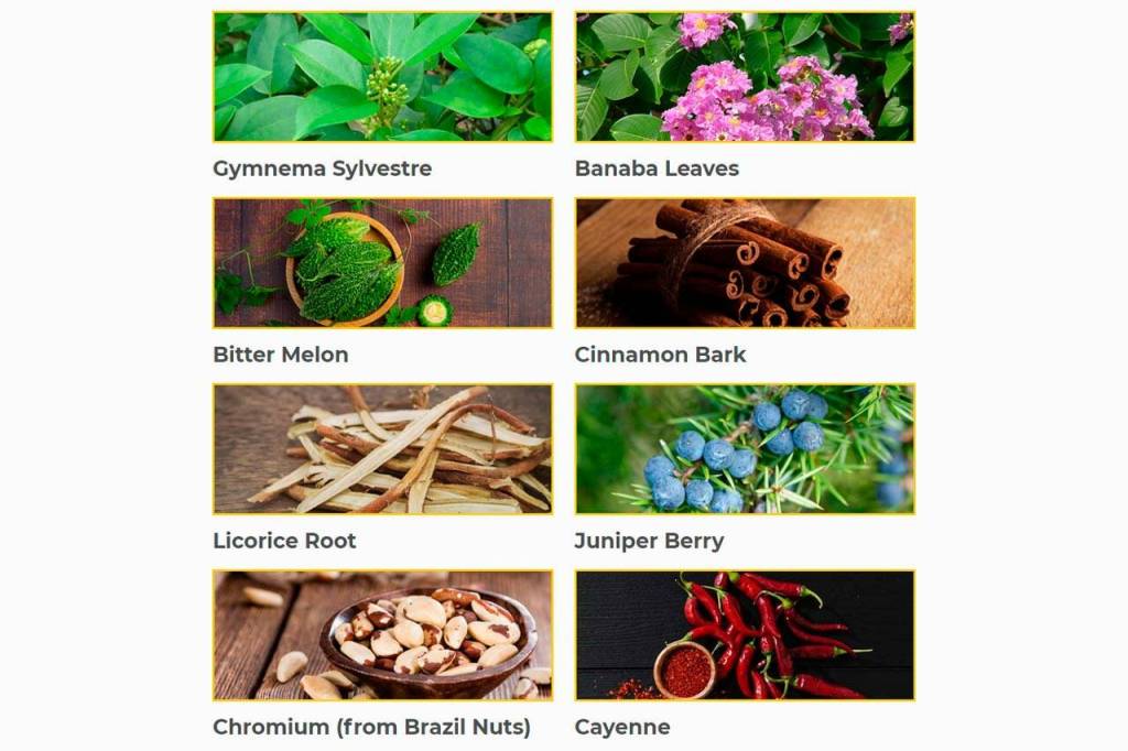 Key ingredients include Gymnema Sylvestre, Banaba leaves, Bitter Melon, Cinnamon Bark, Licorice Root, Juniper Berry, Chromium, and Cayenne, each contributing to its effectiveness.