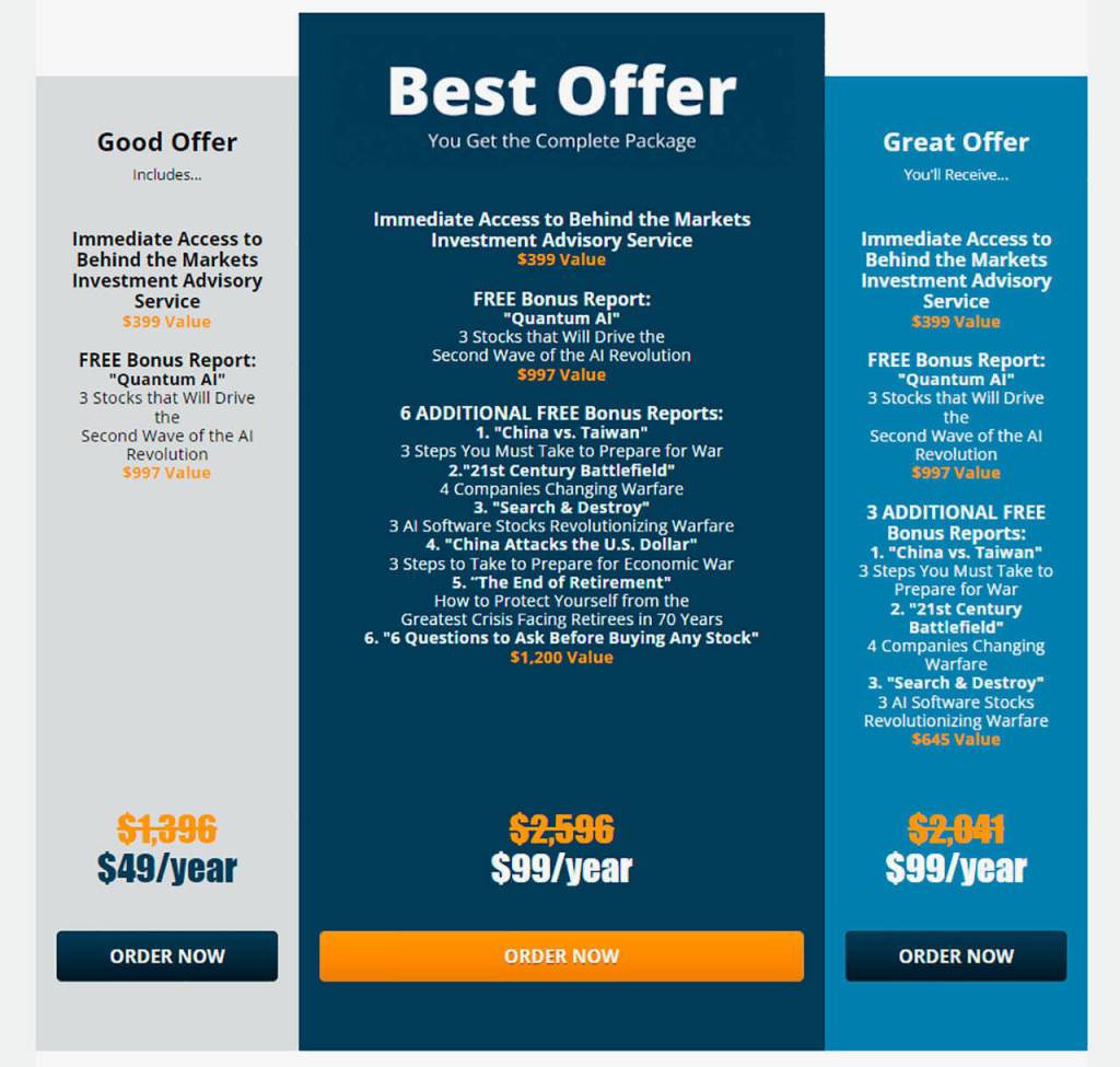 Behind the Markets is normally priced at $196 to $399 per year. As part of a 2024 promotion, however, you can pay just $49 to $99 for your first year, lock in a discounted rate thereafter, and receive a bundle of bonus reports.
