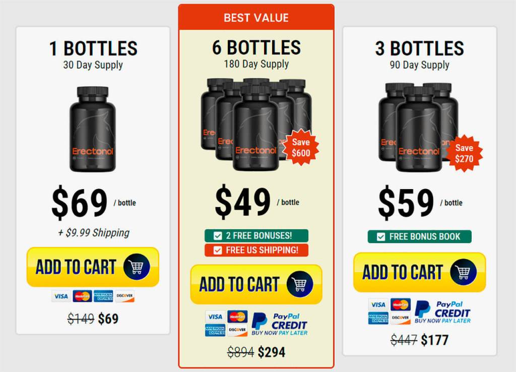 - 90-day supply of Erectonol: $177 + $9.99 Shipping + Free Bonus eBook