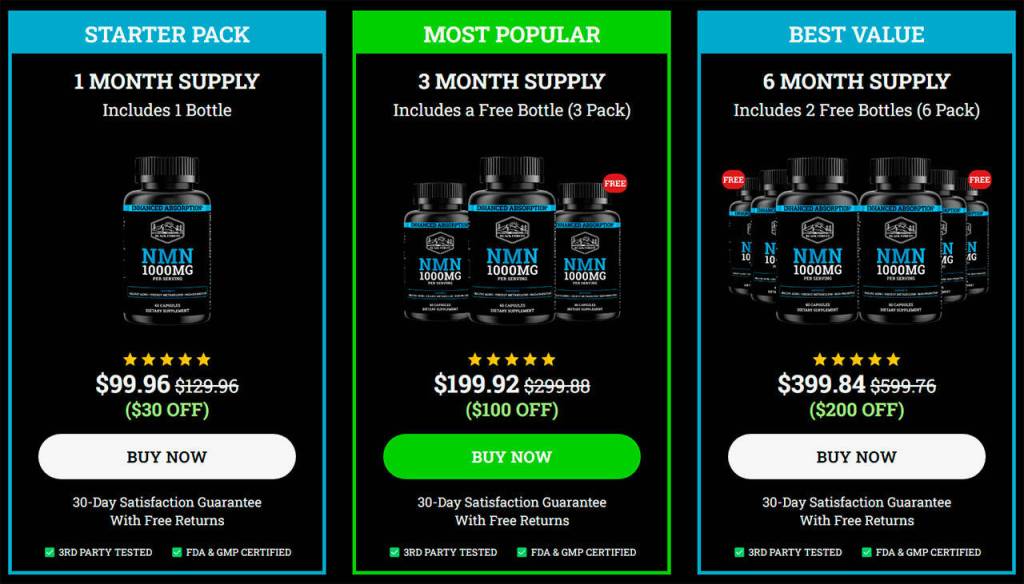 Each Black Forest NMN bottle includes 30 servings. Since time is needed to accumulate NAD levels, the creators recommend taking the supplement for at least six months. To facilitate bulk purchases, the team is offering three different price options at checkout, as seen below: