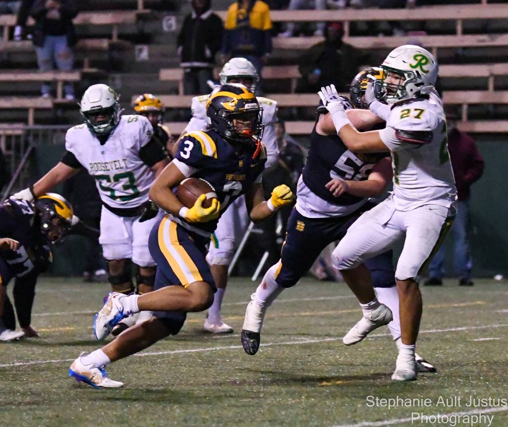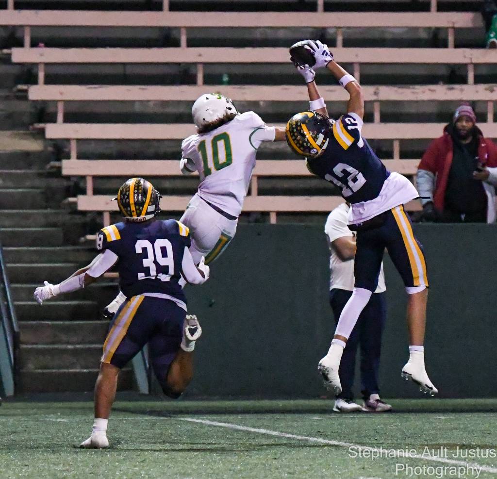 In a battle of the unbeatens, No. 1-seeded Bellevue (12-0) will take on No. 2-seeded O’Dea (13-0) in the 3A state football final at 7 p.m. on Dec. 6 at University of Washington’s Husky Stadium. During Bellevue’s 29-13 state semifinal victory over Roosevelt on Nov. 30, Wolverine senior Bryce Smith snags the first of his two second-half interceptions at Seattle’s Memorial Stadium. Photo courtesy of Stephanie Ault Justus