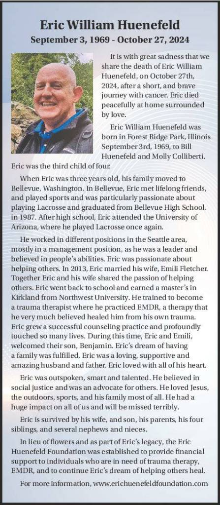 It is with great sadness that we share the death of Eric William Huenefeld, on October 27th, 2024, after a short, and brave journey with cancer. Eric died peacefully at home surrounded by love.