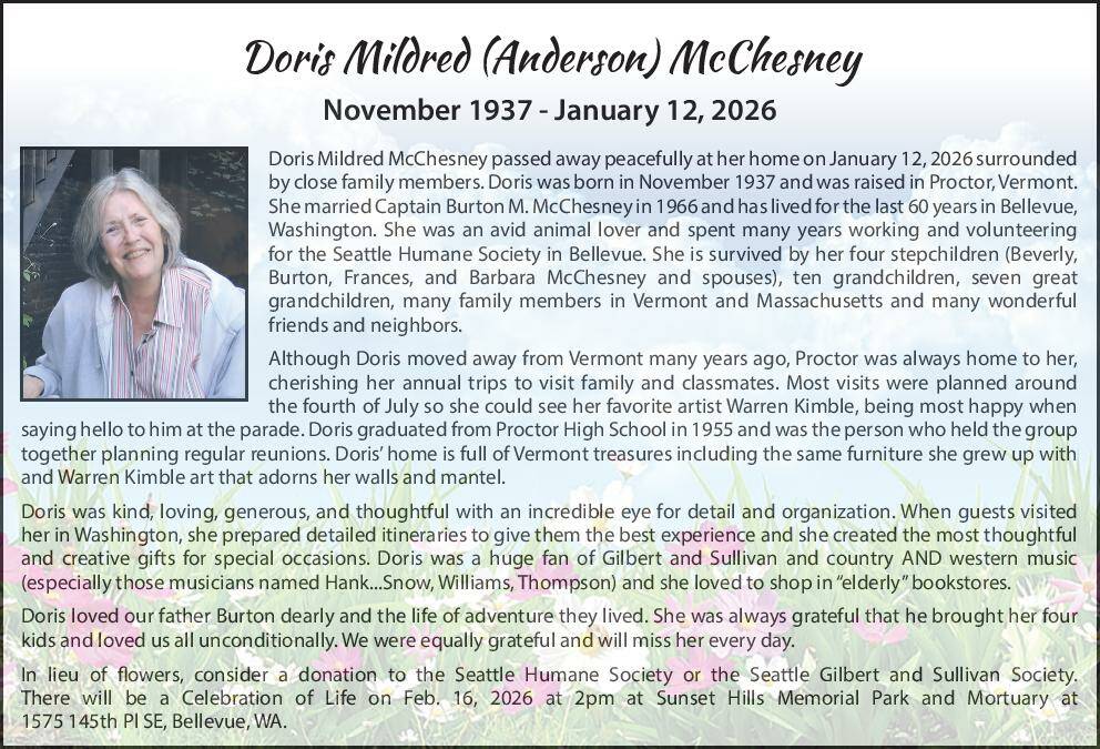 Doris Mildred McChesney passed away peacefully at her home on January 12, 2026 surrounded by close family members. Doris was born in November 1937 and was raised in Proctor, Vermont. She married Captain Burton M. McChesney in 1966 and has lived for the last 60 years in Bellevue, Washington. She was an avid animal lover and spent many years working and volunteering for the Seattle Humane Society in Bellevue. She is survived by her four stepchildren (Beverly, Burton, Frances, and Barbara McChesney and spouses), ten grandchildren, seven great grandchildren, many family members in Vermont and Massachusetts and many wonderful friends and neighbors.