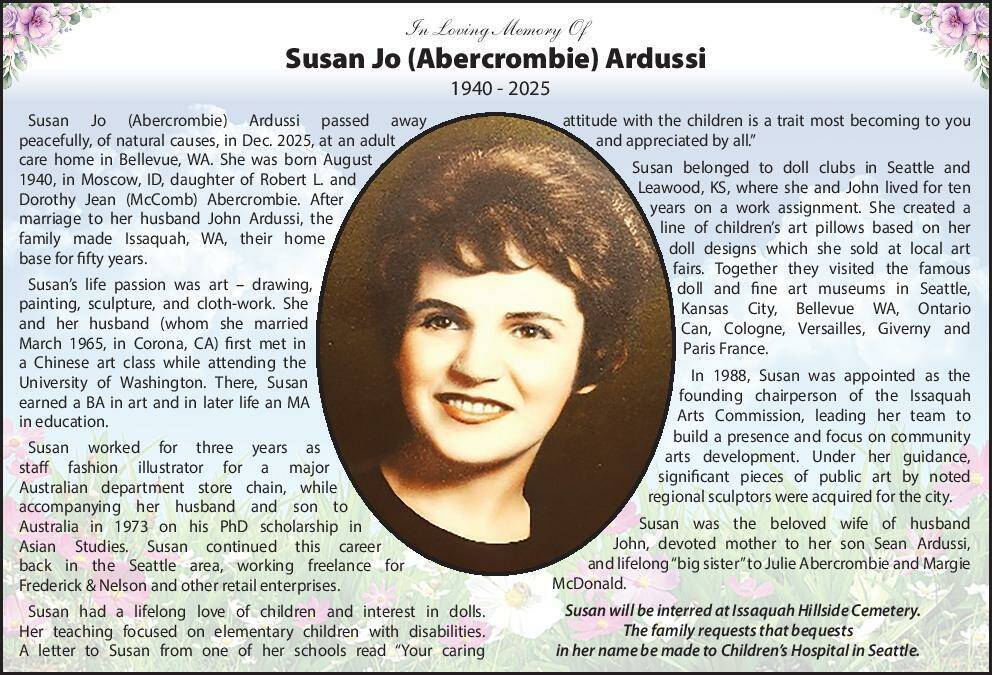 Susan Jo (Abercrombie) Ardussi passed away peacefully, of natural causes, in Dec. 2025, at an adult care home in Bellevue, WA. She was born August 1940, in Moscow, ID, daughter of Robert L. and Dorothy Jean (McComb) Abercrombie. After marriage to her husband John Ardussi, the family made Issaquah, WA, their home base for fifty years.