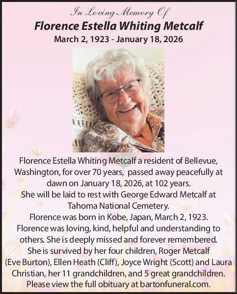 Florence Estella Whiting Metcalf, a resident of Bellevue, Washington for over 70 years, passed away peacefully at dawn on January 18, 2026, at 102 years. She will be laid to rest with George Edward Metcalf at Tahoma National Cemetery.