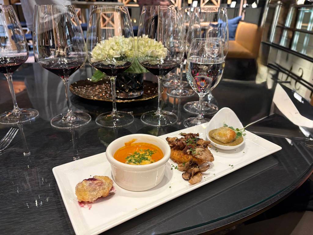 After being handed a freebie glass of Stella Blanca, the only white wine on offer, we were seated at an elegant table. The menu listed four red wines, each paired with food designed to complement the grape. A 3” ball of baked brie stuffed with luscious plum jam started us off, complementing a Columbia Valley Merlot. Next on the menu: roasted tomato soup, perfectly matched to the Stella Maris Red Blend, also from the Columbia Valley. Next, duck confit and mushroom ragu on crispy herb polenta, paired with Walla Walla Cabernet. I almost swooned. The last bite, Beef Wellington, accompanied a glass of Columbia Valley Petit Verdot, a full-bodied wine with intense color and high tannins. These wines range from $50 to $70 a bottle.