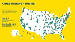 A map showing the cities ranked on the Human Rights Campaign's Municipal Equality Index.