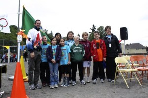 Fourth and fifth graders from Bennett Elementary pose with former Olympian Brad Barquist and Principal Nicole Hemworth as part of the Bennett Olympics opening ceremony.