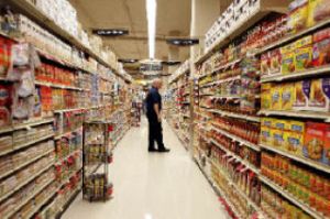 Safeway employee Bob Holloway checks the perfectly lined shelves prior to the grand opening of the new store in the Avalon apartment complex.