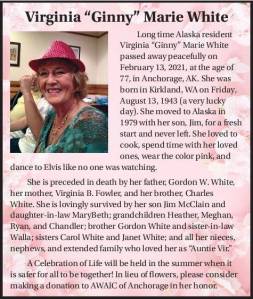 Longtime Alaska resident Virginia “Ginny” Marie White passed away peacefully on February 13, 2021, at the age of…
