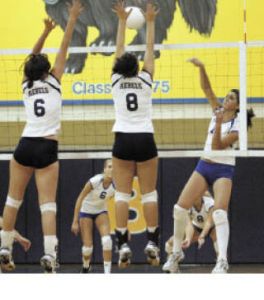 Natalie Rauschenbach and Brittney Webster of Juanita leap to block a Bellevue shot in Wednesday’s match.