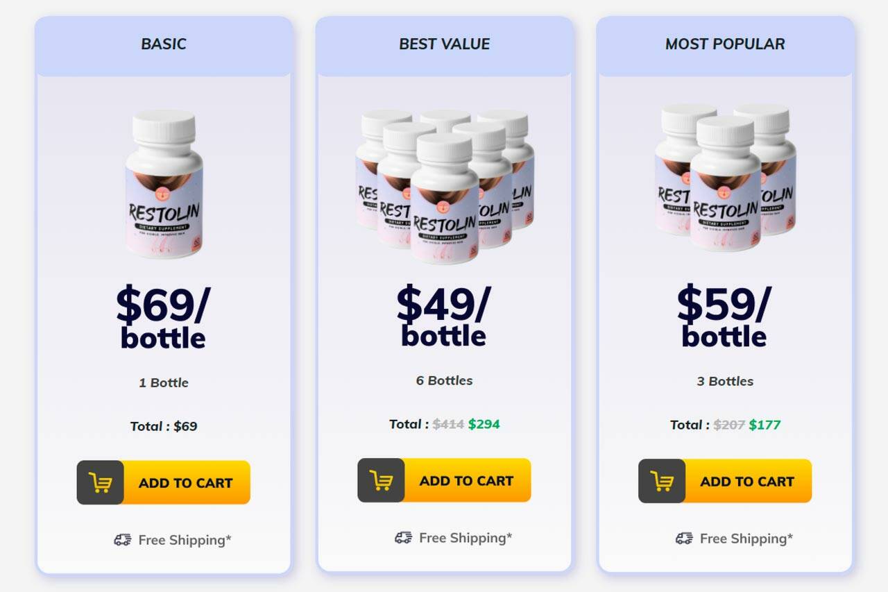 Consumers can only order Restolin from the official website, with several packages to choose from. Each one lowers the total cost per bottle, allowing users to commit to a larger package to get a discount.