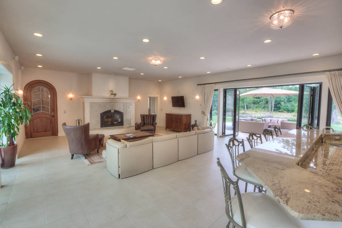 The unparalleled main home, a single-storey 5,792-square-foot structure built into a natural hillside, has room for your large family or guests, with five bedrooms and 3-1/2 bathrooms. There’s plenty of parking/storage space in six garages – attached and detached – and a custom-built helipad is ready for those special guests to drop in.