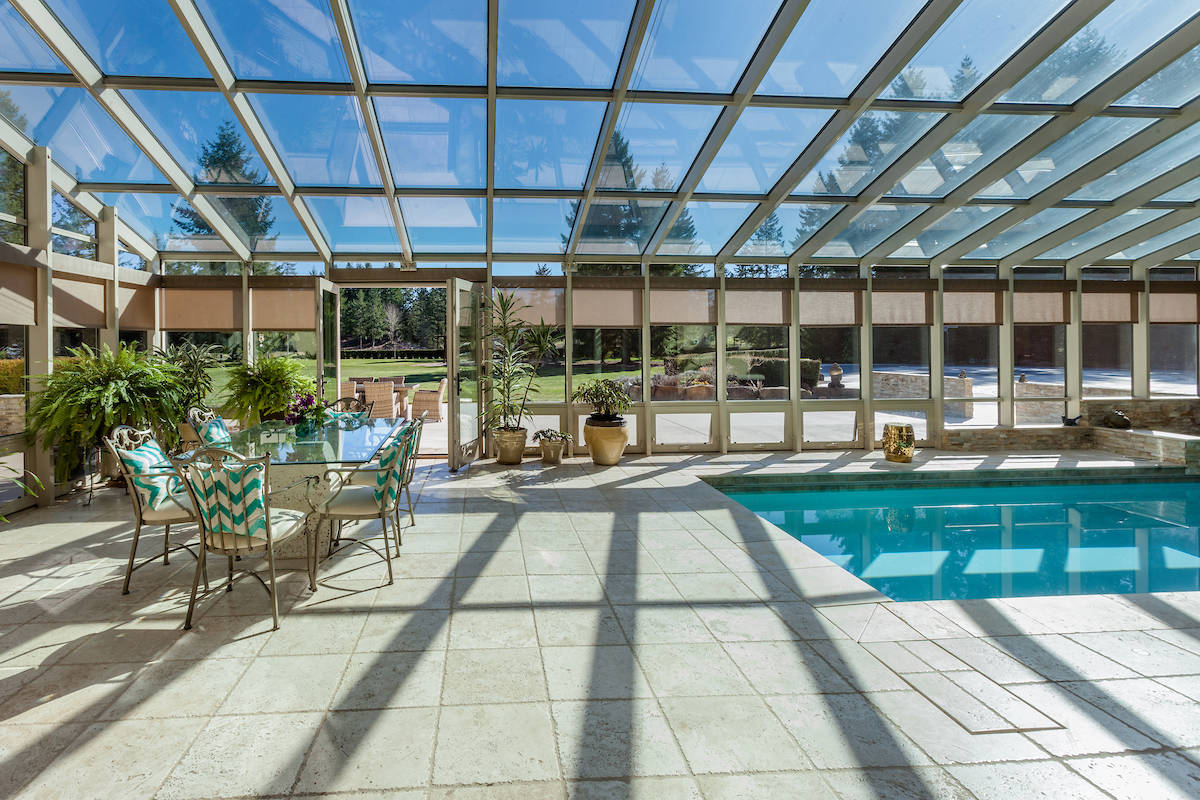 - A sunroom with in-ground swimming pool offers year-round entertainment options, with large skylight panels over the entire area