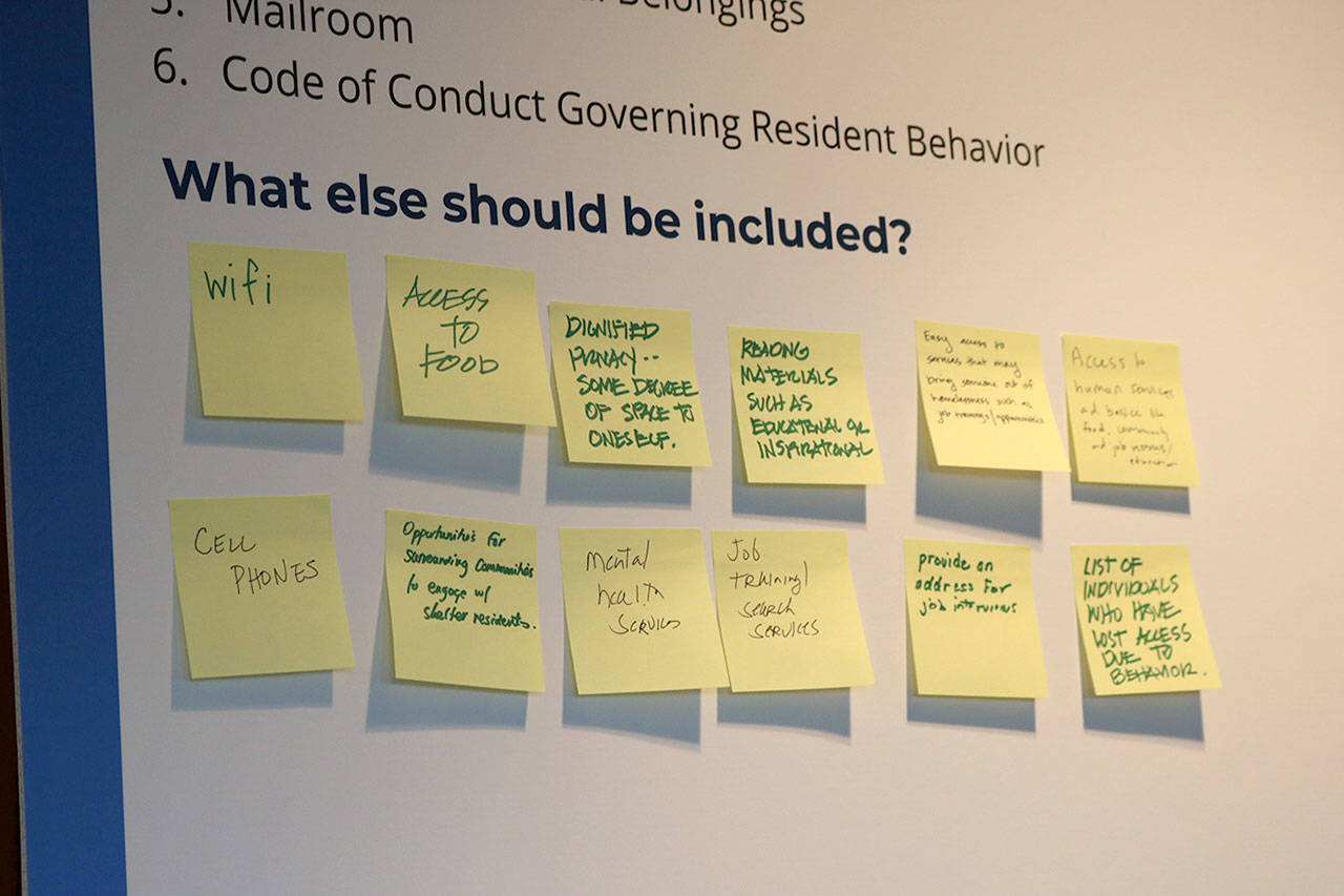 City staff answered questions and took feedback on several topics that night, including questions regarding what type of zoning a shelter can be located in and what types of services should be nearby.