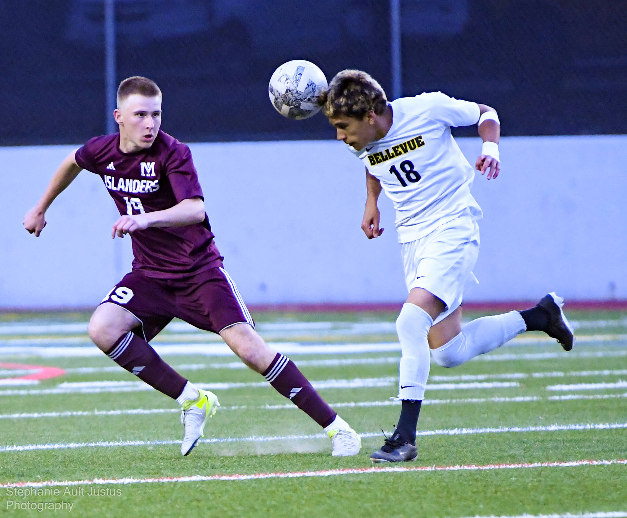 Bellevue High senior goalie Nick Matty makes a save while Bellevue junior Josh DePalma looks on during the Wolverines’ 3-2 loss to Mercer Island High on May 13 in the 3A KingCo tournament championship match. The score was tied 2-2 at the end of regulation and overtime and was decided in penalty kicks. Photo courtesy of Stephanie Ault Justus