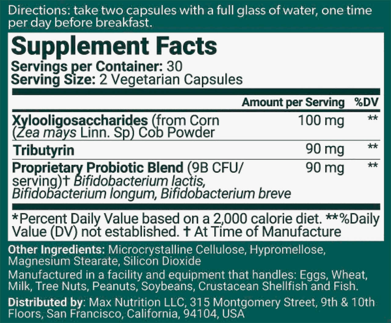 Key Composition: Xylooligosaccharides, Tributyrin, Bifidobacterium lactis, Bifidobacterium longum, and Bifidobacterium breve